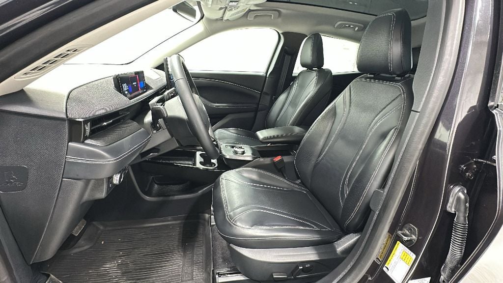 This 2022 Ford Mustang Mach-E is equipped with Equipment Group 300A, Interior Protection Package (Pre-Installed) (Cargo Area Protector and Front & Rear Floor Liners), Navigation system: Connected Navigation, 10 Speakers, 4-Wheel Disc Brakes, ABS brakes, Active Park Assist Prep Kit, Air Conditioning, Alloy wheels, AM/FM radio: SiriusXM with 360L, AM/FM Stereo, Apple CarPlay/Android Auto, Auto High-beam Headlights, Auto-dimming Rear-View mirror, Automatic temperature control, Axle Ratio: 9.05, Brake assist, Bumpers: body-color, Compass, Delay-off headlights, Driver door bin, Driver vanity mirror, Dual front impact airbags, Dual front side impact airbags, Electronic Stability Control, Emergency communication system: 911 Assist, Exterior Parking Camera Rear, Four wheel independent suspension, Front anti-roll bar, Front Bucket Seats, Front Center Armrest, Front dual zone A/C, Front reading lights, Fully automatic headlights, Garage door transmitter, Heated door mirrors, Heated front seats, Heated Perforated ActiveX Bucket Seats, Heated steering wheel, Illuminated entry, Knee airbag, Low tire pressure warning, Memory seat, Occupant sensing airbag, Outside temperature display, Overhead airbag, Overhead console, Panic alarm, Passenger door bin, Passenger vanity mirror, Power door mirrors, Power driver seat, Power Liftgate, Power passenger seat, Power steering, Power windows, Radio data system, Rain sensing wipers, Rear anti-roll bar, Rear seat center armrest, Rear side impact airbag, Rear window defroster, Rear window wiper, Remote keyless entry, Security system, SiriusXM Radio w/360L, Speed control, Speed-sensing steering, Speed-Sensitive Wipers, Split folding rear seat, Spoiler, Steering wheel mounted audio controls, SYNC 4A w/Enhanced Voice Recognition, Telescoping steering wheel, Tilt steering wheel, Traction control, Trip computer, Turn signal indicator mirrors, Variably intermittent wipers, and Wheels: 19 Machined-Face Aluminum.