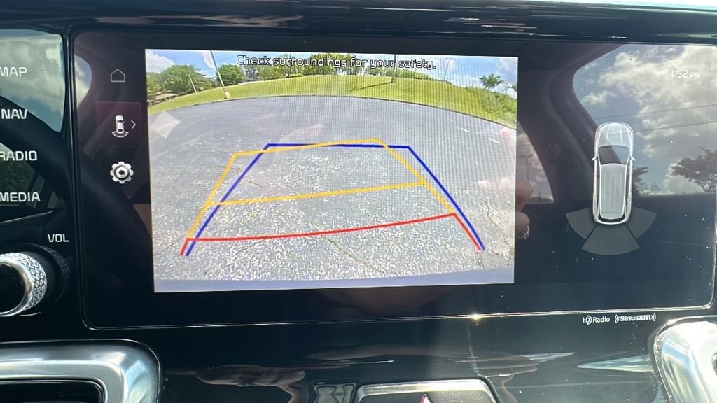 This 2023 Kia Sorento is equipped with Navigation System, 3.316 Axle Ratio, 3rd row seats: split-bench, 4-Wheel Disc Brakes, 6 Speakers, ABS brakes, Air Conditioning, Alloy wheels, AM/FM radio: SiriusXM, Apple CarPlay & Android Auto, Auto High-beam Headlights, Auto-dimming Rear-View mirror, Automatic temperature control, Brake assist, Bumpers: body-color, Cargo Cover, Carpet Floor Mats, Cross Bars, Delay-off headlights, Driver door bin, Driver vanity mirror, Dual front impact airbags, Dual front side impact airbags, EC Mirror w/HomeLink Plug-N-Play, Electronic Stability Control, Emergency communication system, Exterior Parking Camera Rear, Folding Cargo Tray, Four wheel independent suspension, Front anti-roll bar, Front Bucket Seats, Front Center Armrest, Front dual zone A/C, Front fog lights, Front reading lights, Fully automatic headlights, Heated door mirrors, Heated Front Bucket Seats, Heated front seats, Illuminated entry, Knee airbag, Leather steering wheel, Low tire pressure warning, Occupant sensing airbag, Outside temperature display, Overhead airbag, Overhead console, Panic alarm, Passenger door bin, Passenger vanity mirror, Power door mirrors, Power driver seat, Power Liftgate, Power moonroof, Power passenger seat, Power steering, Power windows, Radio data system, Radio: AM/FM Audio System, Rain sensing wipers, Rear air conditioning, Rear anti-roll bar, Rear reading lights, Rear window defroster, Rear window wiper, Remote keyless entry, Roof rack: rails only, Security system, Smart Key w/ Push Button and Remote Start, Speed control, Speed-sensing steering, Split folding rear seat, Spoiler, Steering wheel mounted audio controls, SynTex Artificial Leather Seat Trim, Tachometer, Telescoping steering wheel, Textured Rear Bumper Applique, Tilt steering wheel, Traction control, Trip computer, Turn signal indicator mirrors, Variably intermittent wipers, and Wheels: 8.5J x 20 Gloss Black Alloy.