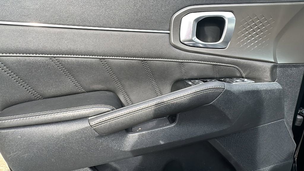 This 2023 Kia Sorento is equipped with AWD, Navigation System, 3.316 Axle Ratio, 3rd row seats: split-bench, 4-Wheel Disc Brakes, 6 Speakers, ABS brakes, Air Conditioning, Alloy wheels, AM/FM radio: SiriusXM, Apple CarPlay & Android Auto, Auto High-beam Headlights, Auto-dimming Rear-View mirror, Automatic temperature control, Brake assist, Bumpers: body-color, Carpet Floor Mats, Delay-off headlights, Driver door bin, Driver vanity mirror, Dual front impact airbags, Dual front side impact airbags, Electronic Stability Control, Emergency communication system, Exterior Parking Camera Rear, Four wheel independent suspension, Front anti-roll bar, Front Bucket Seats, Front Center Armrest, Front dual zone A/C, Front fog lights, Front reading lights, Fully automatic headlights, Heated door mirrors, Heated Front Bucket Seats, Heated front seats, Illuminated entry, Knee airbag, Leather steering wheel, Low tire pressure warning, Occupant sensing airbag, Outside temperature display, Overhead airbag, Overhead console, Panic alarm, Passenger door bin, Passenger vanity mirror, Power door mirrors, Power driver seat, Power Liftgate, Power moonroof, Power passenger seat, Power steering, Power windows, Radio data system, Radio: AM/FM Audio System, Rain sensing wipers, Rear air conditioning, Rear anti-roll bar, Rear reading lights, Rear window defroster, Rear window wiper, Remote keyless entry, Roof rack: rails only, Security system, Smart Key w/ Push Button and Remote Start, Speed control, Speed-sensing steering, Split folding rear seat, Spoiler, Steering wheel mounted audio controls, SynTex Artificial Leather Seat Trim, Tachometer, Telescoping steering wheel, Tilt steering wheel, Traction control, Trip computer, Turn signal indicator mirrors, Variably intermittent wipers, and Wheels: 8.5J x 20 Gloss Black Alloy.