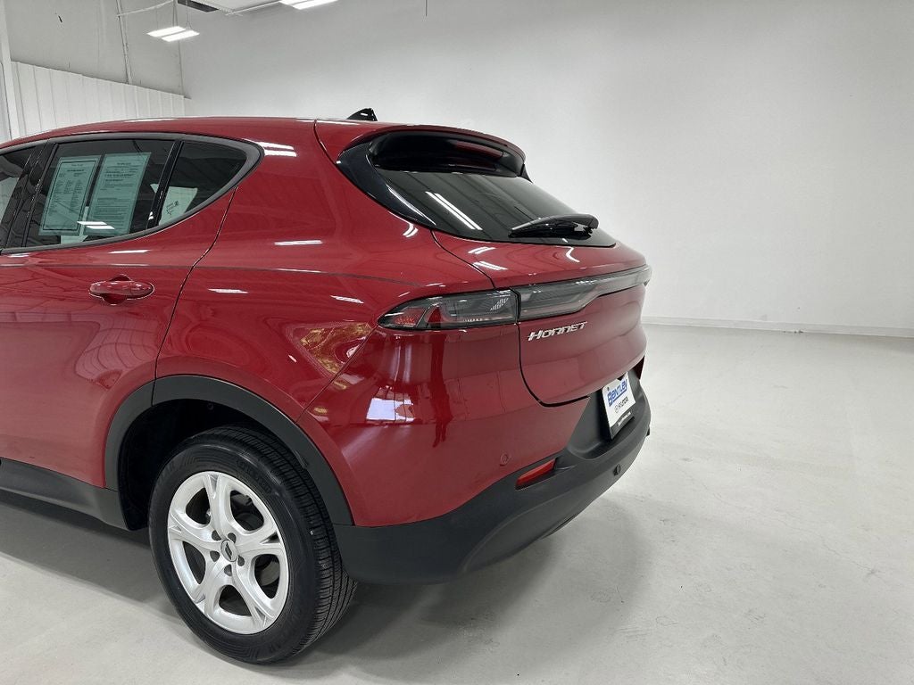 This 2024 Dodge Hornet is equipped with Quick Order Package 23M (DISC), 10.25 Touchscreen Display, 4-Wheel Disc Brakes, 6 Speakers, ABS brakes, Air Conditioning, Alloy wheels, AM/FM radio: SiriusXM, Anti-whiplash front head restraints, Apple CarPlay, Apple CarPlay/Android Auto, Auto High-beam Headlights, Brake assist, Bumpers: body-color, Cloth/Leatherette Seats, Compass, Connectivity - US/Canada, Delay-off headlights, Disassociated Touchscreen Display, Driver door bin, Driver vanity mirror, Dual front impact airbags, Dual front side impact airbags, Electronic Stability Control, Emergency communication system: Dodge Connect, Four wheel independent suspension, Front anti-roll bar, Front Bucket Seats, Front Center Armrest w/Storage, Front dual zone A/C, Front reading lights, Fully automatic headlights, Google Android Auto, GPS Antenna Input, Heated door mirrors, Illuminated entry, Integrated Center Stack Radio, Knee airbag, Lane Departure Warning System, Leather steering wheel, Low tire pressure warning, Manual Adjust 6-Way Driver Seat, Manual Adjust 6-Way Front Passenger Seat, Normal Duty Suspension, Occupant sensing airbag, Outside temperature display, Overhead airbag, Overhead console, Panic alarm, ParkView Rear Back-Up Camera, Passenger door bin, Passenger vanity mirror, Power door mirrors, Power steering, Power windows, Radio: Uconnect 5 w/10.25 Display, Rain sensing wipers, Rear anti-roll bar, Rear seat center armrest, Rear window defroster, Rear window wiper, Remote keyless entry, Security system, Speed control, Speed-sensing steering, Split folding rear seat, Spoiler, Tachometer, TBD Axle Ratio, Telescoping steering wheel, Tilt steering wheel, Traction control, Trip computer, Turn signal indicator mirrors, Variably intermittent wipers, and Wheels: 17 x 7 Silver Aluminum.