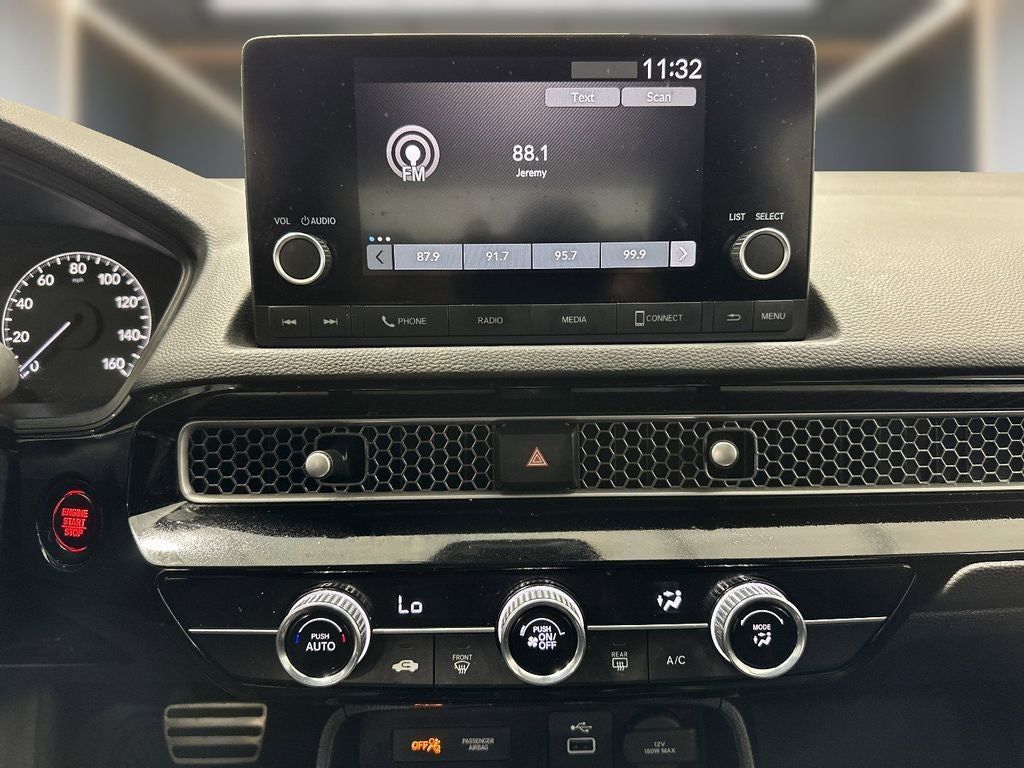 This 2024 Honda Civic is equipped with Black Artificial Leather, 4-Wheel Disc Brakes, 8 Speakers, ABS brakes, Adaptive Cruise Control: Adaptive Cruise Control (ACC) with Low-Speed Follow, Air Conditioning, Alloy wheels, AM/FM radio, Apple CarPlay/Android Auto, Auto High-beam Headlights, Automatic temperature control, Brake assist, Bumpers: body-color, Cloth/Leatherette Seating Surfaces, Delay-off headlights, Driver door bin, Driver vanity mirror, Dual front impact airbags, Dual front side impact airbags, Electronic Stability Control, Emergency communication system: HondaLink, Exterior Parking Camera Rear, Four wheel independent suspension, Front anti-roll bar, Front Bucket Seats, Front Center Armrest, Front reading lights, Fully automatic headlights, Illuminated entry, Knee airbag, Leather Shift Knob, Leather steering wheel, Low tire pressure warning, Occupant sensing airbag, Outside temperature display, Overhead airbag, Panic alarm, Passenger door bin, Passenger vanity mirror, Power door mirrors, Power steering, Power windows, Radio data system, Radio: 180-Watt Audio System, Rear anti-roll bar, Rear side impact airbag, Rear window defroster, Remote keyless entry, Security system, Speed control, Speed-sensing steering, Steering wheel mounted audio controls, Tachometer, Telescoping steering wheel, Tilt steering wheel, Traction control, Trip computer, and Wheels: 18 Gloss Black Alloy.