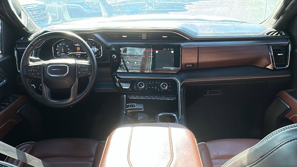 This 2025 GMC Sierra 1500 is equipped with Preferred Equipment Group 5SB (120-Volt Bed Mounted Power Outlet, 120-Volt Interior Power Outlet, 2 Charge/Data USB Ports Inside Center Console, 2 Type-C Charge-Only Rear USB Ports, 2 USB Ports, Auto-Locking Rear Differential, Bed View Camera, Bose Premium Series w/12-Speaker System, Chrome Recovery Hooks, Color-Keyed Carpeting Floor Covering, Deep-Tinted Glass, Electric Rear-Window Defogger, Floor-Mounted Center Console, Front Rain-Sensing Wipers, HD Surround Vision, Heated 2nd Row Outboard Seats, Heated Driver & Front Outboard Passenger Seating, Heavy-Duty Air Filter, High Gloss Black Header w/Signature Denali Grille, Hill Descent Control, Hitch View, In-Vehicle Trailering System App, Integrated Trailer Brake Controller, Keyless Open & Start, LED Cargo Area Lighting, Multicolor 15 Diagonal Head-Up Display, MultiPro Tailgate Audio System by Kicker (LPO), OnStar Services Capable, Perimeter Lighting, Power Door Locks, Power Front Passenger Windows w/Express Up/Down, Power Front Windows w/Driver Express Up/Down, Power Rake & Telescoping Steering Column, Power Rear Windows w/Express Down, Power Sliding Rear Window w/Rear Defogger, Power Sunroof, Push Button Start, Rear Cross Traffic Braking, Rear Pedestrian Detection, Rear Wheelhouse Liners, Remote Vehicle Starter System, SiriusXM w/360L Trial Subscription, Spray-On Pickup Bedliner w/GMC Logo, Steering Wheel Audio Controls, Theft Deterrent System (Unauthorized Entry), Trailer Camera Provisions, Trailer Side Blind Zone Alert, Trailer Tire Pressure Monitor System, Ultrasonic Front & Rear Park Assist, Universal Home Remote, Ventilated Driver & Front Passenger Seats, Wi-Fi Hotspot Capable, and Wireless Charging), Trailering Package (Hitch Guidance), 10-Speed Automatic, 4WD, Alpine Umber Leather, Navigation System, 12 Speakers, 16-Way Power Driver Seat Adjuster w/Lumbar, 16-Way Power Passenger Seat Adjuster w/Lumbar, 170 Amp Alternator, 3.23 Rear Axle Ratio, 4-Wheel Disc Brakes, ABS brakes, Adaptive suspension, Air Conditioning, Alloy wheels, AM/FM radio: SiriusXM with 360L, Apple CarPlay/Android Auto, Auto High-beam Headlights, Auto-dimming door mirrors, Auto-dimming Rear-View mirror, Automatic temperature control, Brake assist, Buckle to Drive, Bumpers: body-color, Compass, Delay-off headlights, Denali Premium Suspension w/Adaptive Ride Control, Driver door bin, Driver Memory, Driver vanity mirror, Dual Active Exhaust, Dual front impact airbags, Dual front side impact airbags, Electronic Stability Control, Emergency communication system: OnStar, Enhanced Automatic Emergency Braking, Following Distance Indicator, Forward Collision Alert, Front anti-roll bar, Front Bucket Seats, Front Center Armrest, Front dual zone A/C, Front fog lights, Front Pedestrian Braking, Front reading lights, Front wheel independent suspension, Full Grain Leather Seat Trim, Fully automatic headlights, Garage door transmitter, Genuine wood console insert, Genuine wood dashboard insert, Genuine wood door panel insert, Heads-Up Display, Heated door mirrors, Heated front seats, Heated rear seats, Heated steering wheel, Illuminated entry, IntelliBeam Automatic High Beam On/Off, Low tire pressure warning, Memory seat, Occupant sensing airbag, Outside temperature display, Overhead airbag, Overhead console, Panic alarm, Passenger door bin, Passenger vanity mirror, Performance Air Intake System, Power door mirrors, Power driver seat, Power moonroof, Power passenger seat, Power steering, Power windows, Radio data system, Radio: Premium GMC Infotainment Audio System, Rain sensing wipers, Rear reading lights, Rear seat center armrest, Rear step bumper, Rear window defroster, Remote keyless entry, Safety Alert Seat, Security system, Speed control, Speed-sensing steering, Split folding rear seat, Steering wheel mounted audio controls, Super Cruise, Tachometer, Telescoping steering wheel, Tilt steering wheel, Traction control, Trip computer, Variably intermittent wipers, Ventilat